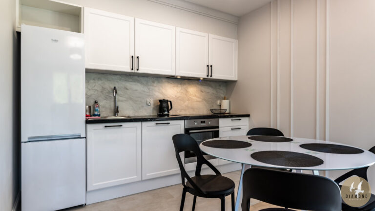 Wyposażenie apartamentu: klimatyzacja, internet, TV – 120 kanałów, żelazko i deska do prasowania, suszarka na pranie, odkurzacz, pościel i ręczniki, zmywarka, lodówka, zamrażarka, płyta kuchenna indukcyjna 4 palnikowa, piekarnik, pełne wyposażenie kuchni – talerze, sztućce, kieliszki czajnik, komplet zastawy kuchennej na 8 osób, garnki, patelnie, parawan.